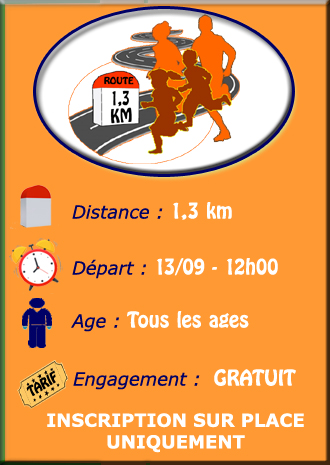 IMPORTANT : Les inscriptions se feront uniquement sur place à partir de 11h00 le dimanche 13. Vous pouvez télécharger le bulletin d’inscription et le remettre le jour même avant le départ.
